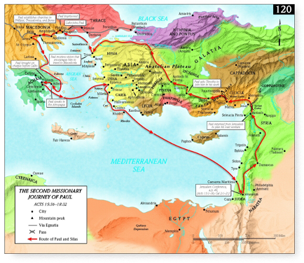 At the end of Acts 15, Paul set out on his second missionary journey with Silas shown in the map above. In Lystra, Paul conscripted another young man named Timothy. Timothy was born to a Jewish mother and Greek father and would eventually lead the church at Ephesus. The other believers regarded Timothy highly. He was a perfect candidate to join Paul in ministry.