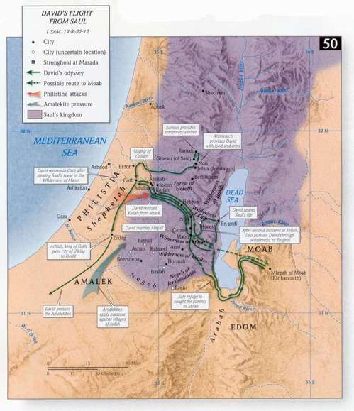 David chased the Amalekites, but 200 of his men stopped at the “brook Besor” (you can see the Bezor on the map from just south of Gaza, the blue dashed line running southeast). When the victorious army returned, some of the men who fought didn’t want to share the spoils when the 200 who had not fought.