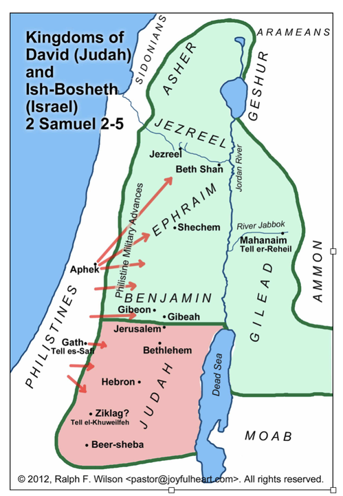 In verses 1-7, David is anointed king over the land of Judah. Here is the problem: David was supposed to be king over all of Israel, and as of now, he is not. In verses 8-11, Abner, a commander of Saul’s army, decides to anoint Ish-bosheth as king over the northern half of Israel. Ish-bosheth is the son of Saul. Abner is trying to continue Saul’s kingdom, even though God had chosen differently. In the image below, can see how Israel was split. David was king over the red areas and Ish-bosheth was king over the green areas.